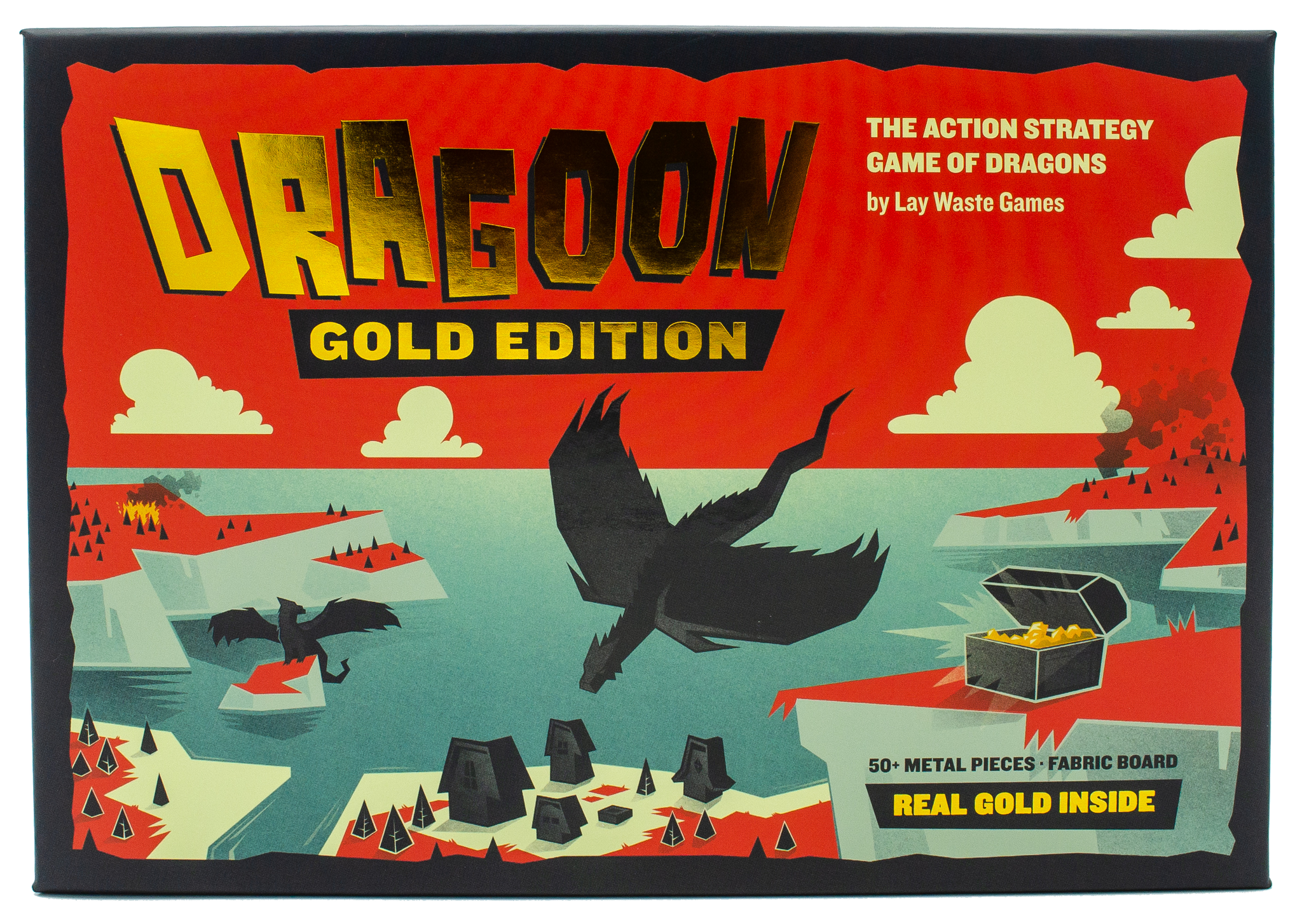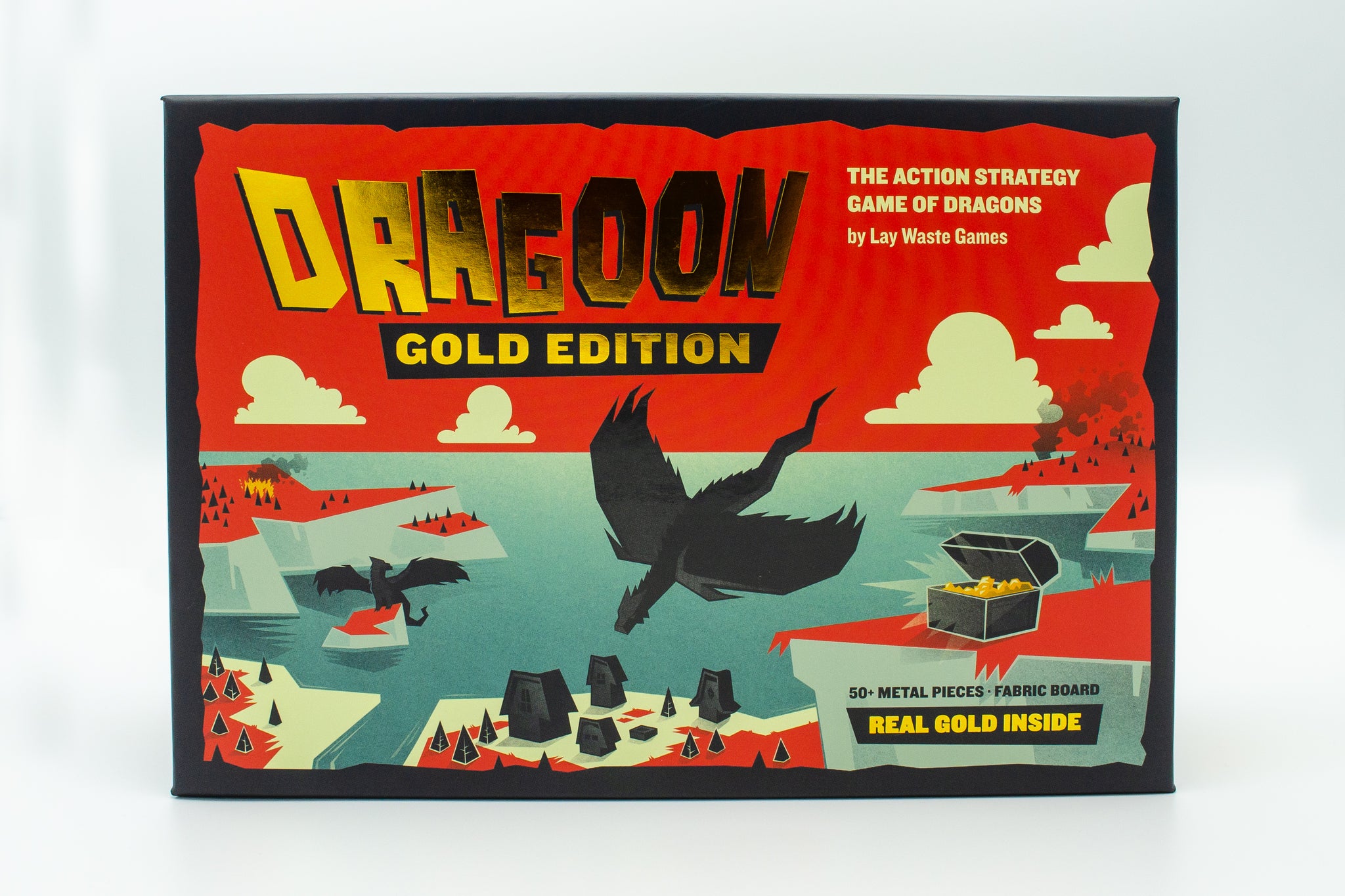 Dragoon is an action-strategy game with an ever-changing landscape. Village and city tiles populate the map each round using a coordinate system. During your turn, choose between claiming villages and cities that pay you tribute, or destroying them outright for instant gold. Challenge other players in dragon-to-dragon combat before they lay waste to your empire or enter your cave to steal your riches. You’re never out of the game until the last gold coin is snatched up!